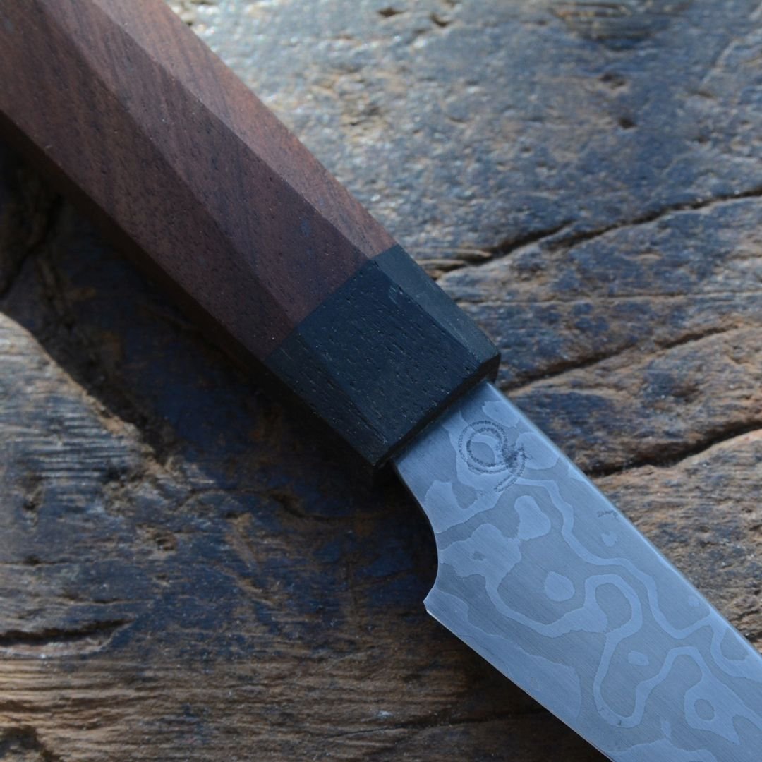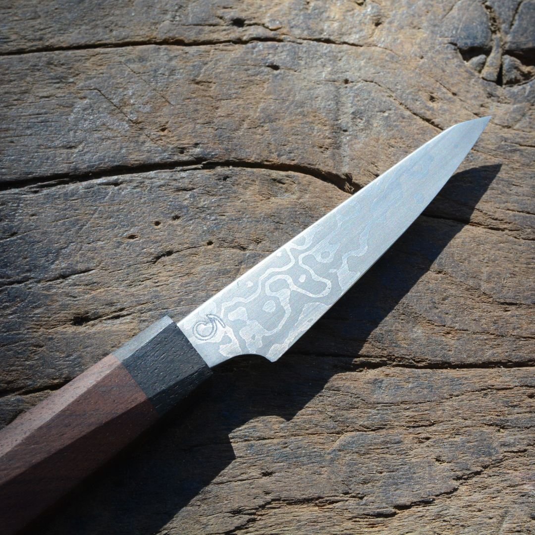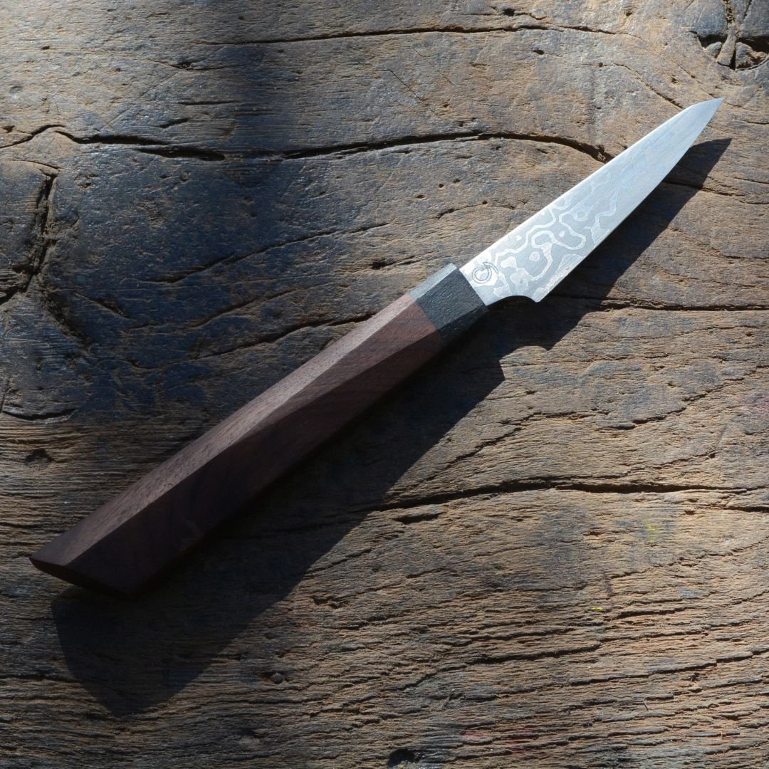 - Paring knife forged out of low layers random damascus, approx. 61 HRC hardness